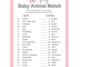 Printable Girl Elephant Baby Animal Game Guess Names Of Baby Animals Printable For Baby Elephant Shower Polka Chevron