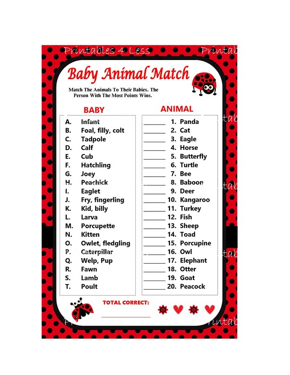 Printable Cute Ladybug Baby Animal Game Guess Names Of Baby Animals Printable For Baby Ladybug Shower Pink Green Polka